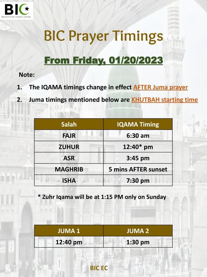 Assalaamu Alaikum Sisters and Brothers. *1.* IQAMA time changes for this week Fajr:6:25 am Note: Only on Sunday the the Zuhr will be at 1:15 pm to accommodate Weekend School Kids and parents *2.* Br Aamir Bashir is c...